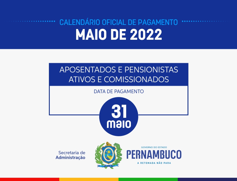 O Governo de Pernambuco vem realizando um trabalho firme e responsável para manter o equilíbrio fiscal e honrar todos os seus compromissos, sobretudo com os servidores públicos estaduais. Neste sentido, a Secretaria de Administração do Estado (SAD) informa que a folha de salários do mês maio de 2022 será paga na próxima terça-feira, dia 31, para todos os aposentados, pensionistas e servidores ativos.